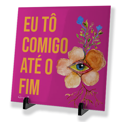 Em um fundo vibrante, "Eu tô comigo até o fim" ecoa força, autoconfiança e o compromisso de estar presente para si mesma, independente das circunstâncias.