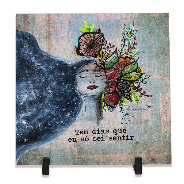 "Tem dias que eu só sei sentir" transmite uma mistura de introspecção e conexão com a natureza e o universo emocional. A figura feminina com olhos fechados remete a um momento de pausa, entrega e interiorização. Sua expressão serena transmite calma, como se estivesse imersa em um estado profundo de sentir e contemplar.
